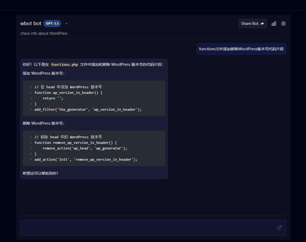 然后您就可以愉快地使用ChatGPT了,虽然是GPT-3.5,但不需要key,也是很爽的一件事情吧。下面让我们来问问如何移除WordPress版本号的代码片段: