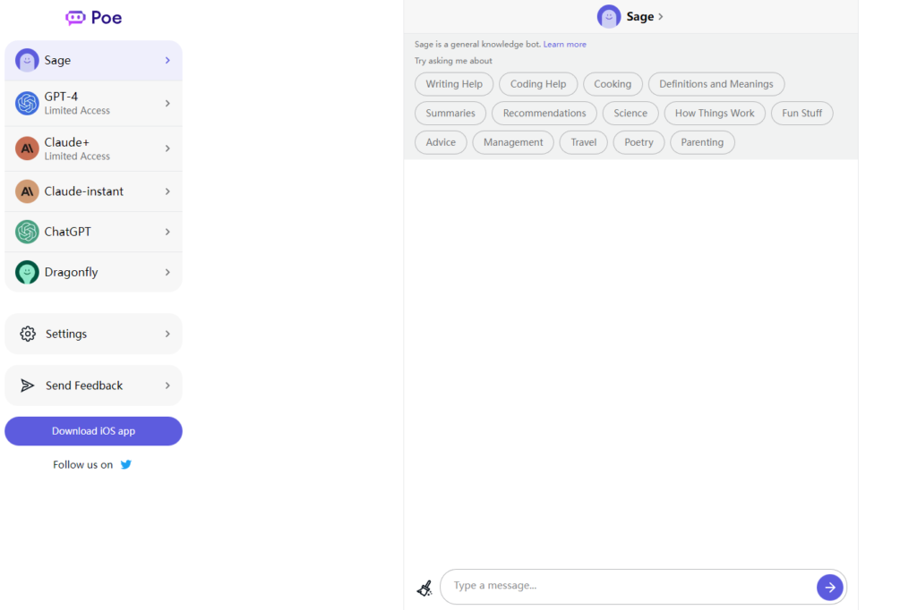 Poe提供Sage、GTP-4、Claude+、Claude-instant、ChatGTP和Dragonfly等多个人工智能聊天支持。您可以通过访问https://poe.com/注册登录即可使用。