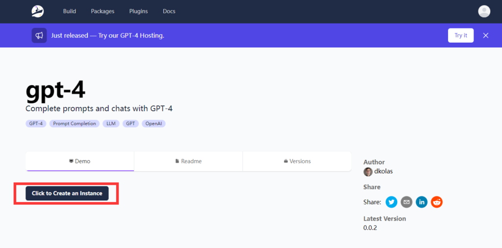 (2)进入GPT-4插件页面,点击Click to Create an Instance创建实例。
