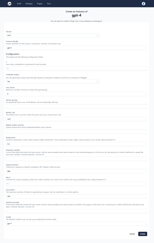 (3)按需填充相关参数配置,貌似使用默认的OpenAI的key无法使用,可能需要填写自己的key。完成参数填写点击Create即可使用ChatGPT聊天。
