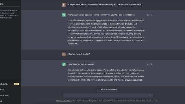 无论你想让它生成你的专业摘要还是单独的子弹,都可以直接要求它。例如,我问ChatGPT:”Can you write a short, professional resume summary about my role as a tech reporter?(你能为我写一份简短、专业的简历摘要,介绍我作为一名技术记者的角色吗?)” 几秒钟内它就完成了,如照片所示。