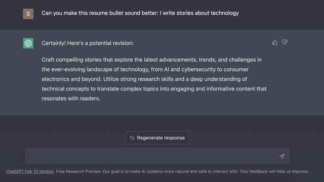 例如,我问ChatGPT,”Can you make this resume bullet sound better: I write stories about technology(你能不能让这个简历的子弹听起来更好: 我写关于技术的故事)”。几秒钟内,它就拿出了一个更精致的要点,融入了专业的语气,并使这个简单的句子更加复杂,如照片所示。一旦你得到了你的结果,你可以随时告诉ChatGPT进一步调整它,比如 “Make it shorter(更精简一些)”或 “Can you include [additional details](你能不能包括[额外的细节])”。