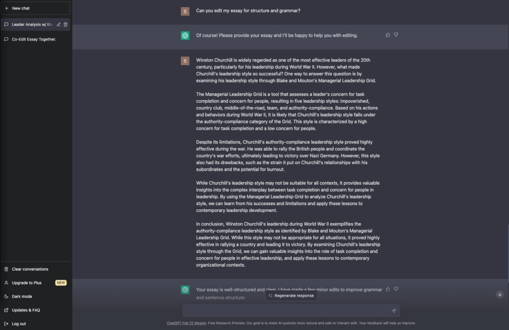你可以简单地告诉聊天机器人你想要它编辑什么。例如,我要求它编辑我们的五段式论文的结构和语法,但其他选项可以包括流程、语气等等。