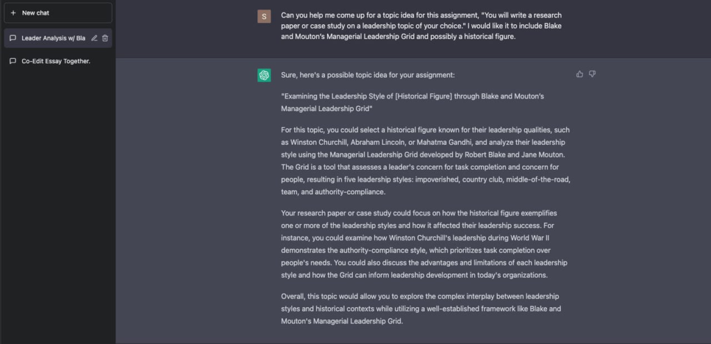 几秒钟内,聊天机器人就做出了回应,为我提供了文章的标题、我可以把文章重点放在的历史人物的选项,以及关于我可以在论文中包括哪些信息的见解,并提供了我可以使用的案例研究的具体例子。