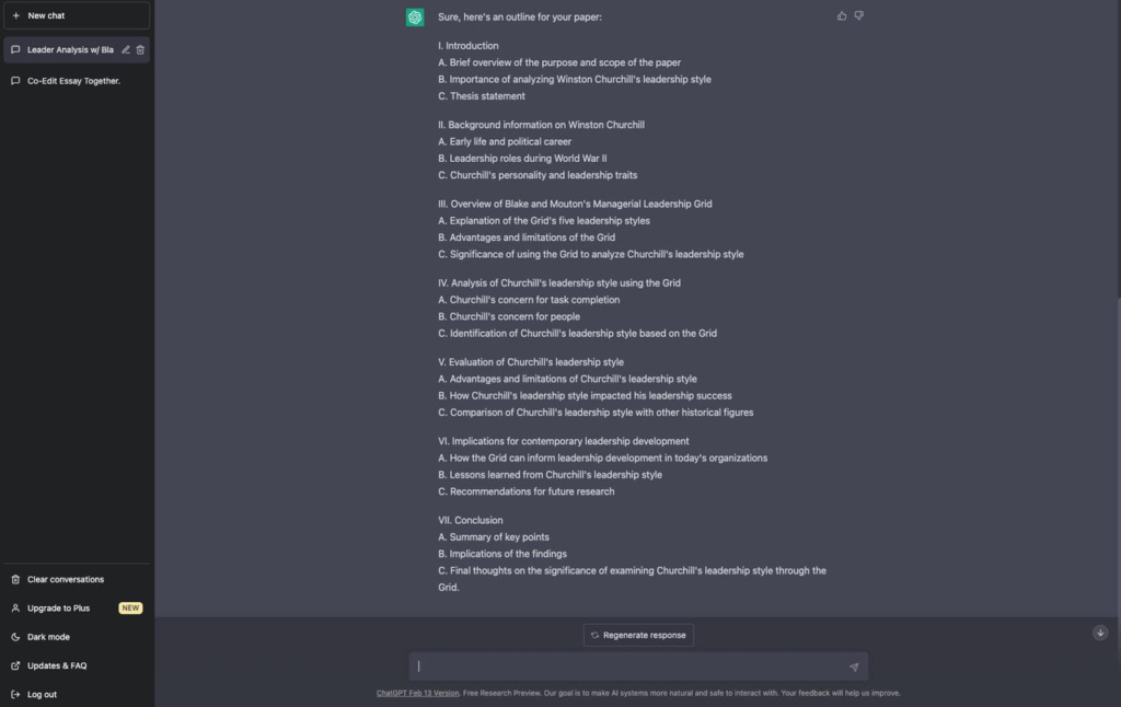 “你能不能为一篇论文创建一个提纲,”通过布莱克和穆顿的管理领导力网格来考察温斯顿-丘吉尔的领导风格”。