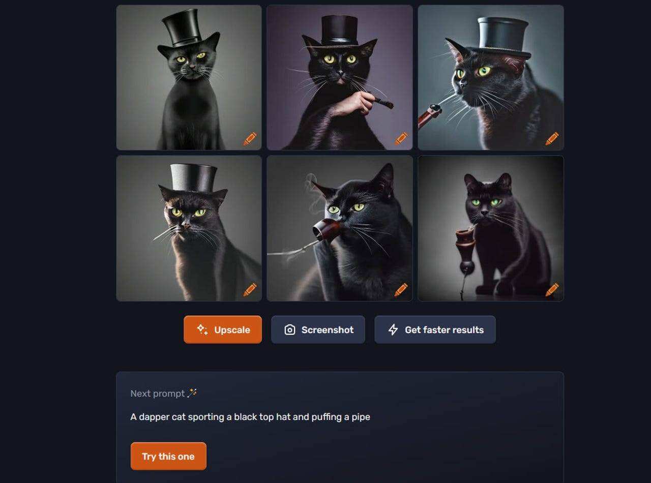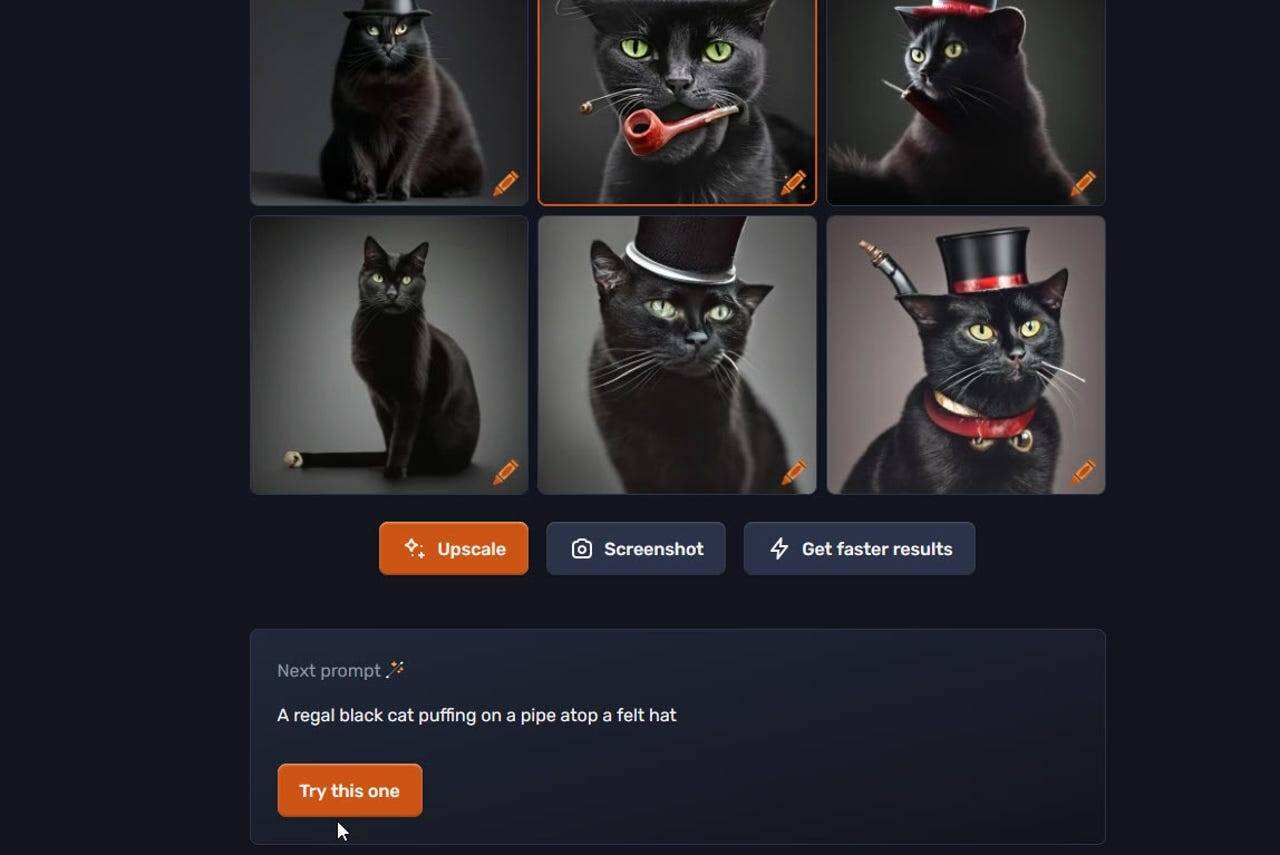 一组新的缩略图被生成,允许你挑选一个你喜欢的,然后放大或保存它。还会建议一个新的提示,你可以修改并再次尝试。