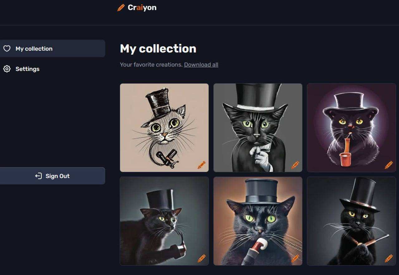 要跟踪生成的图像,请点击顶部的注册按钮,注册一个免费账户。要保存一个图像,点击其心形图标。在你保存了一张或多张图片后,点击顶部的Account按钮,选择 “My Collection” 选项。