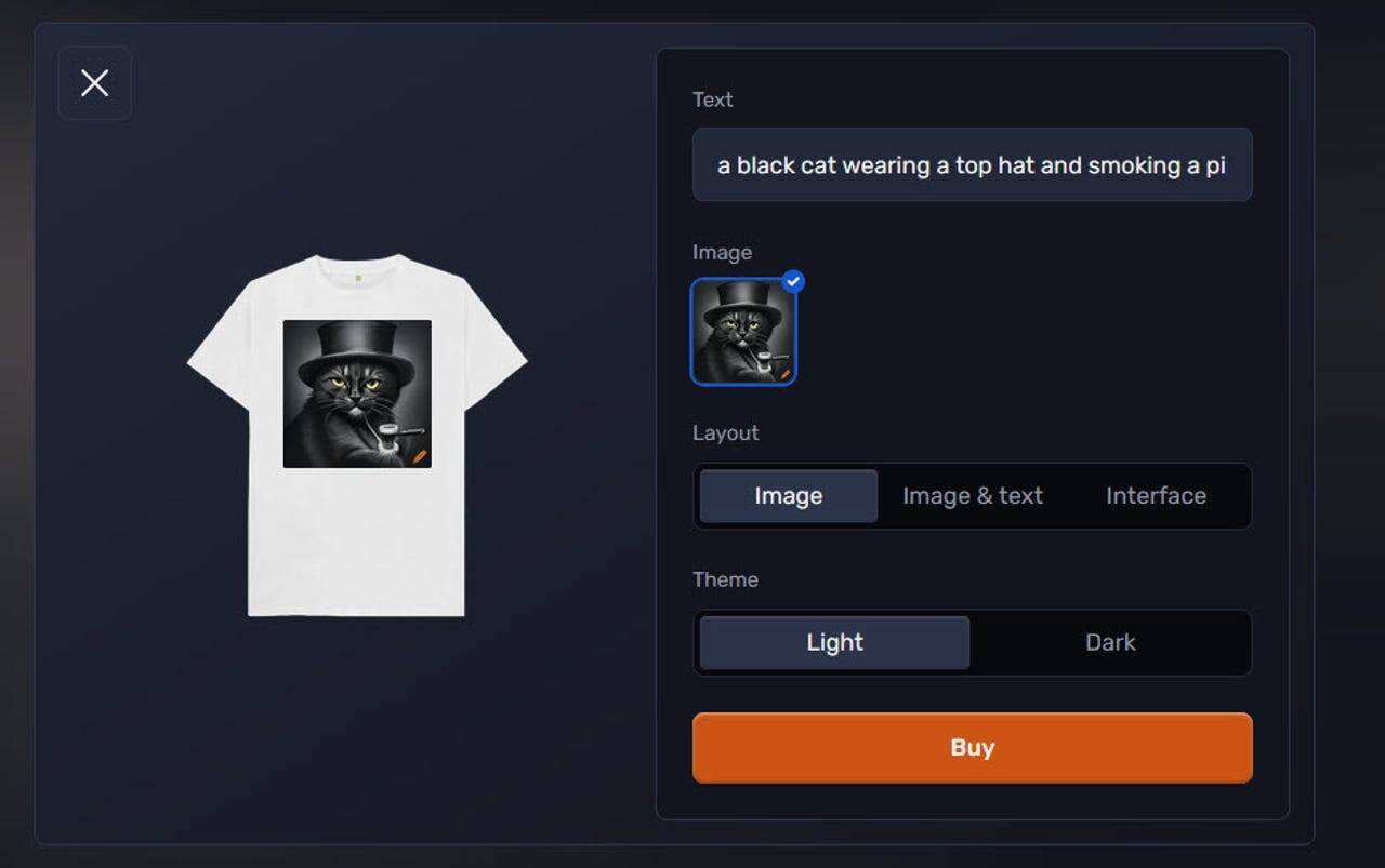 为了帮助挣钱,并为你提供一些很酷的礼品,Craiyon将向你出售一件26美元的T恤衫,上面印有你最喜欢的图片。为此,打开一张图片,点击打印在T恤上的按钮。确认图片,选择浅色或深色主题,然后点击购买。确认你的尺寸并下订单。