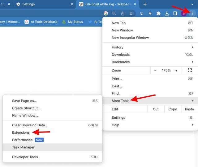 在您的电脑上,点击右上方的省略号图标(三个点)。在下拉菜单上,点击 “更多工具“,然后点击 “扩展程序”。扩展程序菜单将被打开。