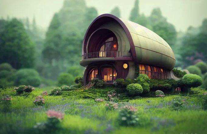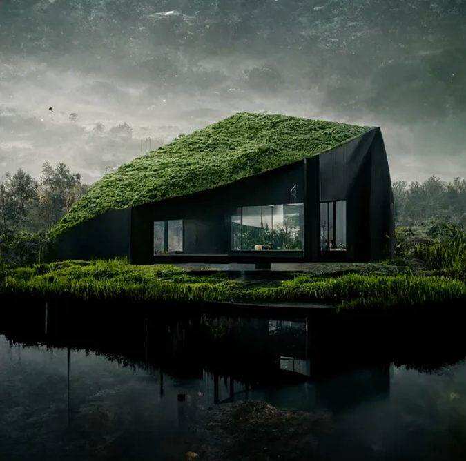 Prompt: Modern home made of black glass covered by lush green landscape, mysterious, octane render, cinematic, rule of thirds