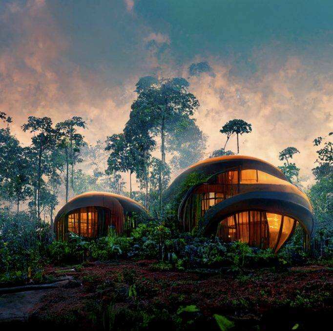 Prompt: Afrofuturist megamansion ecovillage in the congo rainforest, tropical architecture, cinematic lighting, vibrant colors, saturated hues, photorealistic, hyper realistic, surreal, dali, 3d rendering, render, 8k, 16k, extremely detailed, unreal engine, octane, maya