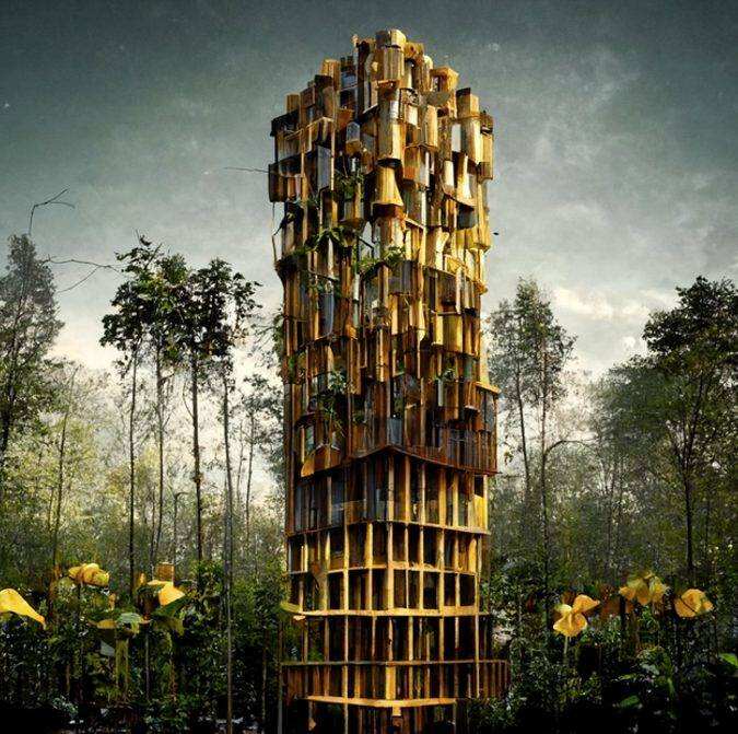 Prompt: Wooden tall building covered with metal flowers into a forest, banana trunk inspiration