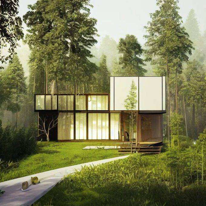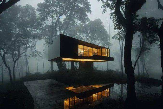 Prompt: PREFAB MODERN VILLA INSIDE A FOREST FILLED WITH RAIN DROPS AND FOG ..8K,DETAILED,RAINING,VIBRANT,SHOT BY SANTOSH SIVAN…