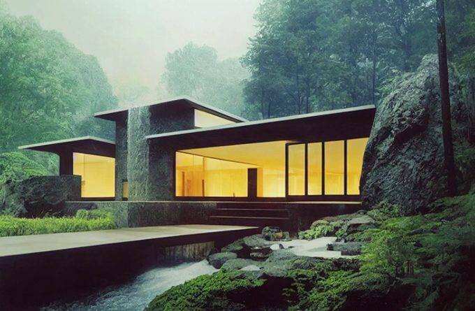Prompt: A waterfall in front of a modern house in the woods, a digital rendering by Maginel Wright Enright Barney, pinterest, modernism, provia, creative commons attribution, biomorphic