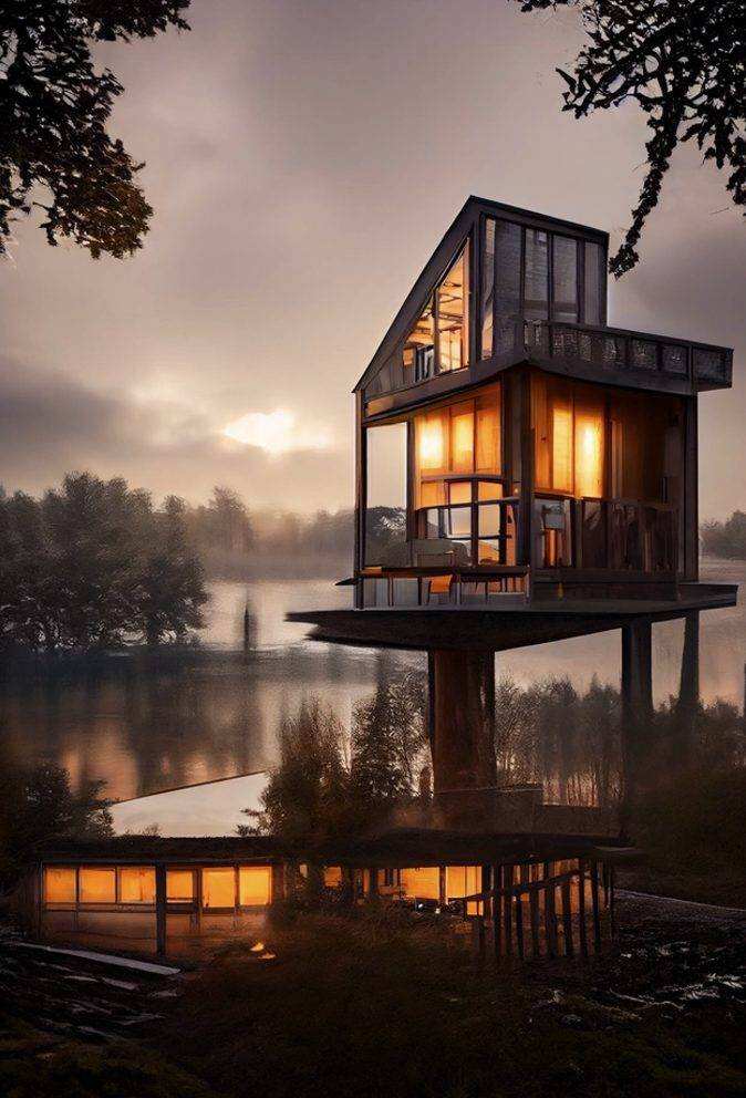 Prompt: A photo of a modern farmhouse style treehouse, overlooking a lake, atmospheric, cinematic, movie lighting, high resolution, award winning architecture, authentic, magical, photorealistic, photo, realistic, sharp photography, ultradetailed, highly focused, dramatic render, 8k hd, octane render, locati architects