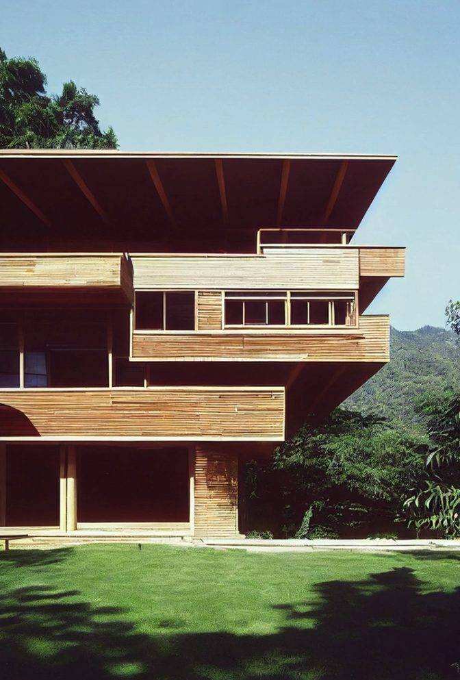 Prompt: Orthographic perspective, exterior, four story home with a bamboo garden, Sunny weather, house architecture, wood construction, wood house, mid-century modern design, cedar wood house, realistic, ultra-realistic, film photograph, Fujichrome Velvia 100F