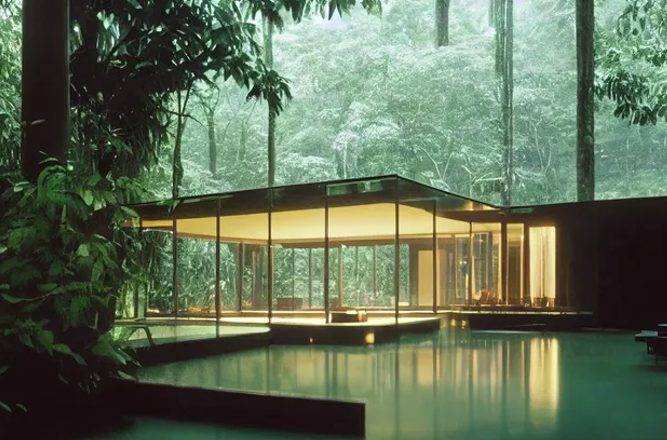Prompt: Philip Johnson’s Glass House in the rainforest, a sense of luxury and style, elegant, sunny, realistic, ultra-realistic, film photograph, Cinestill 800T