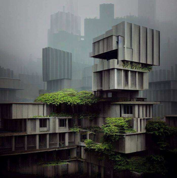 Prompt: Ephemeral brutalist design, ronchamp, octane render 8k, realistic, foggy day, scattered rooftop trees and plants