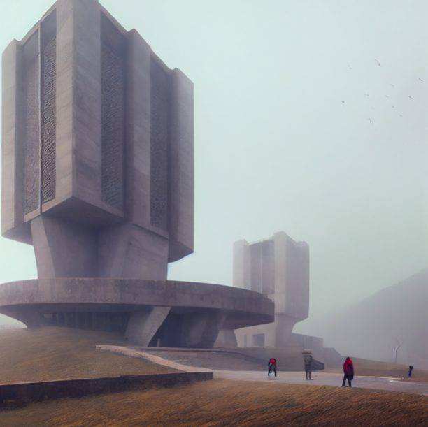 Prompt: vast landscape, dozens of huge Yugoslavian monuments brutalist architecture, futuristic nomads wandering around the base of the monuments, light foggy atmosphere, realistic photograph, 8k, very detailed, film photography by Julius Shulman –upbeta –v 4