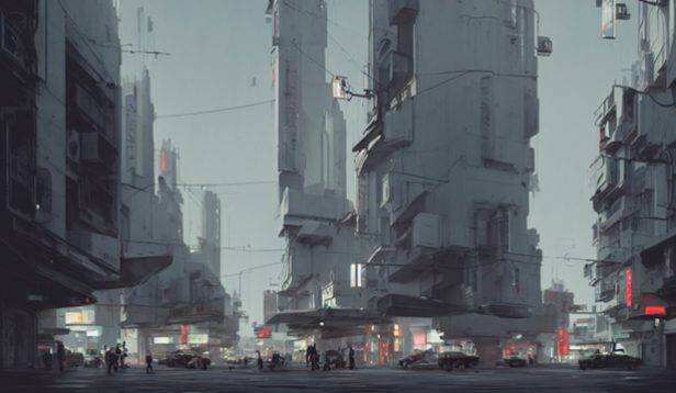 Prompt: photorealistic streetscape, simple brutalist architecture, white neon lights, neon signs, flying vehicles, pedestrians, greg rutkowski, syd mead, ralph mcquarrie, concept art, matte painting, finely detailed, minimal artifacts, rule of thirds, dynamic lighting, cinematic, denoised, centered, artstation
