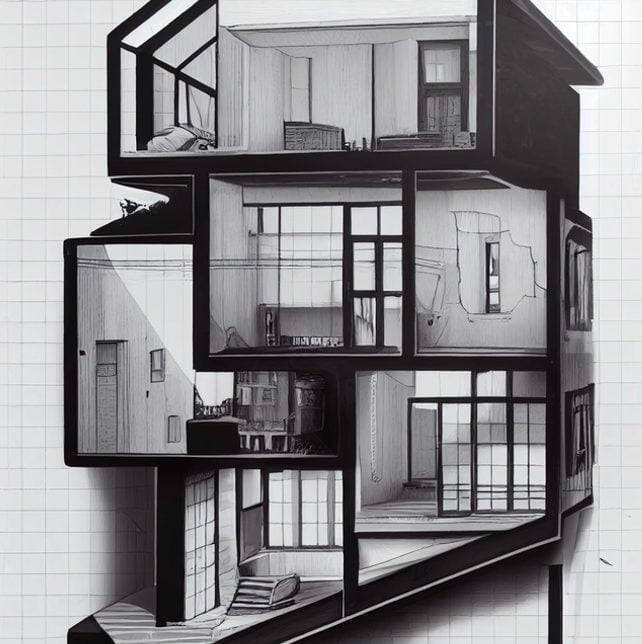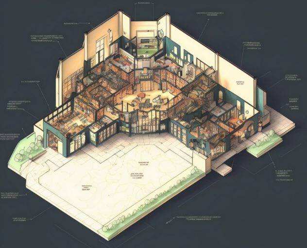 Prompt: Isometric cutaway illustration of a house with hidden secrets