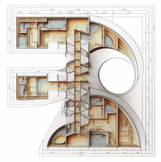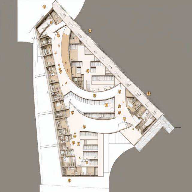 Prompt: architectural floorplan of curve spilling, wide balconies with integrated seating ::4connecting apartment to each other ::1