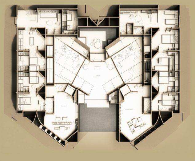 Prompt: architectural floor plan of apartment building, symmetrical layout