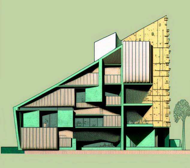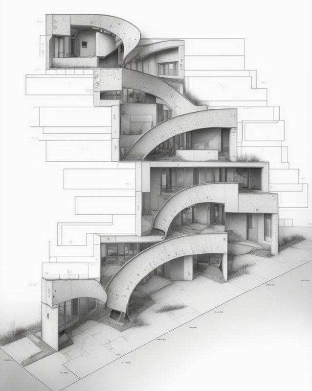 Prompt: CAD drawing cad floorplan glitched together with a section and an elevation of a post modern memphis building