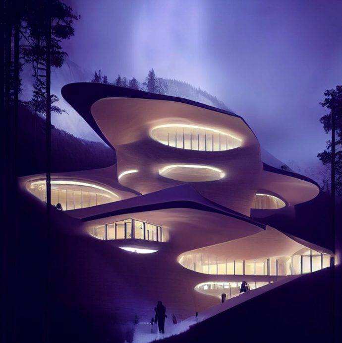 Prompt: Metabolic architecture villa in the mountains designed by Zaha Hadid, continuous white surface with exposed seams, volumetric caustic lighting, photorealistic render, soft reflections, HQ