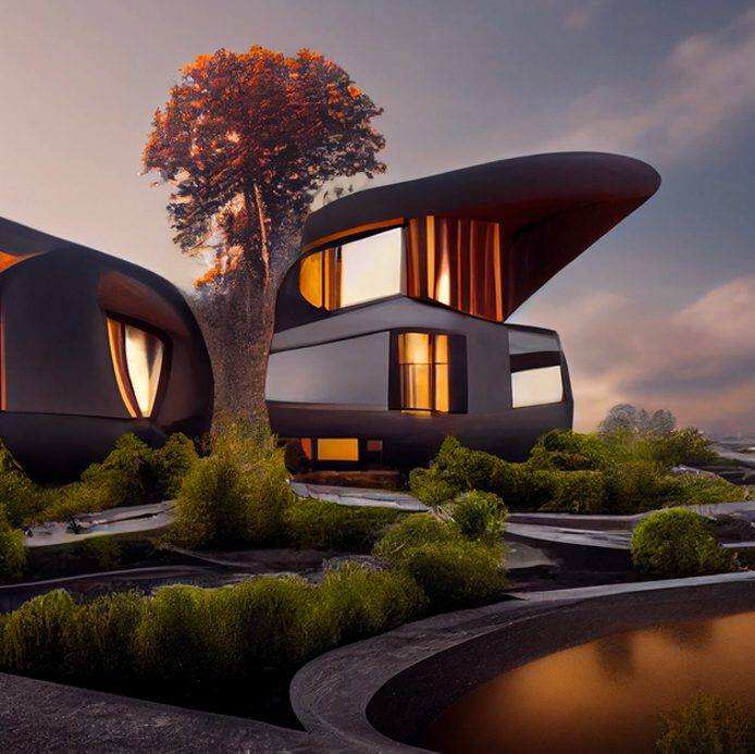 Prompt: Cinematic photo, highly detailled, futuristic, 3D printed, clay, geometric, architectural villa, with artificial lighting, different kinds of vegetation landscaping, daylight, exotic, foggy, octane render, maximum render detail
