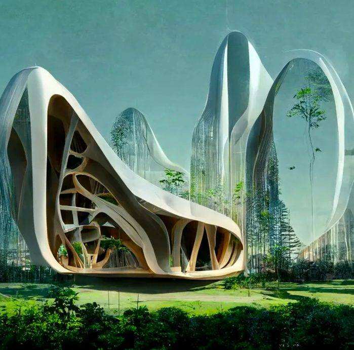 Prompt: Geoffrey Bawa Kundalahalli architecture inspired by Zaha hadid building in a future city glass building in a forest
