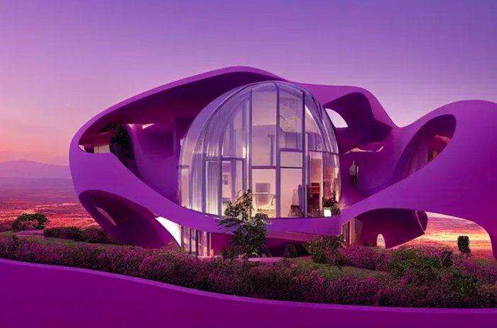 Prompt: Villa sitting in purple landscape, designed by Vincent Callebaut, opulence details, architecture, architectural composition, aerial front view