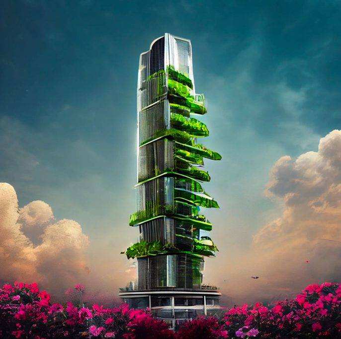 Prompt: Futuristic skyscraper with greens growing and flowering all over