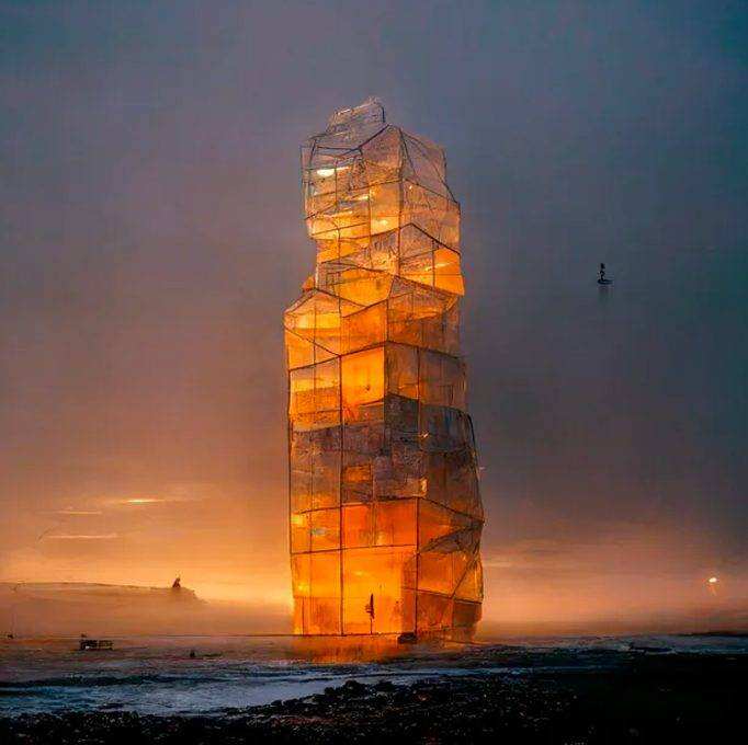 Prompt: architectural photograph of a tower made from stacked inflated, lightweight, transparent and thin cushiony plastic geometries. On a dark Icelandic beach. Sunset, foggy, misty. Wide angle, cinematic, ultra realistic