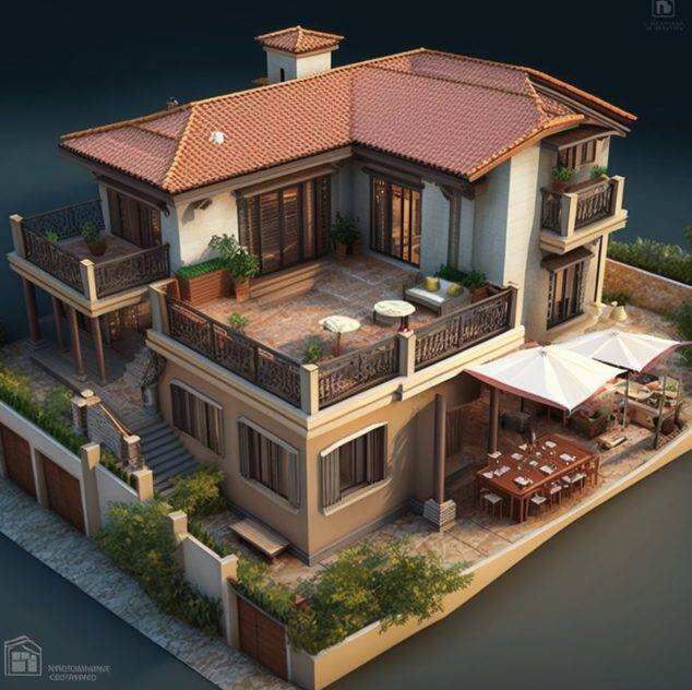 Prompt: a hi res three dimensional realistic style, a morden style one level villa, with a really wide balcony, and the balcony is also really big, the owner can BBQ, and hold a party,