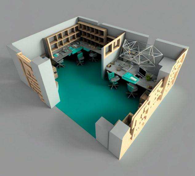 Prompt: a creative office space based on this 3d model, wooden furniture, spatial elements, spaces, working desks with computers facing each others, meeting table, chairs, lighting fixtures, plants, books, decorations, turquoise logo