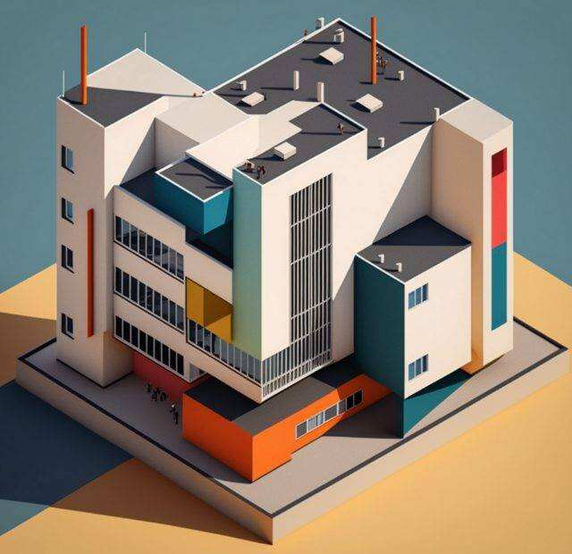 Prompt: bauhaus isometric building designed by Klee, Kandinsky, Albers, Moholy – Nagy, van der Rohe