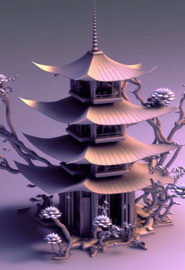 Prompt: The geometric top view of a three – dimensional fractal building inspired by [Pagoda of Fogong Temple], the Chinese classical tower, surrealism, Atompunk style, the tower body has not too much detail. It is a simple and clean toy like building in the style of Pixar Animation, with a sense of giant. Plum, orchid, bamboo and chrysanthemum cluster around the tower, and white cranes fly around the tower. It has a very bright light effect. It is located in the center of the image and has an organic shape, Highly fine, natural and satisfactory texture, dramatic light, hard light, full device, light shadow gradient background, 8k uhd octane rendering