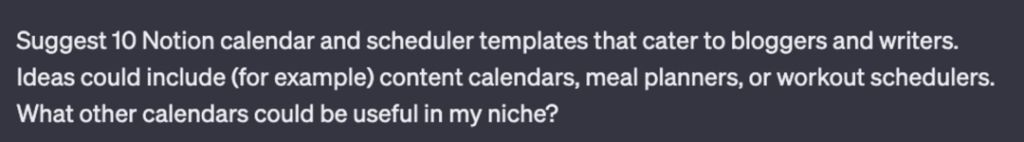 Prompt: Suggest 10 Notion calendar and scheduler templates that cater to[NICHE]. Ideas could include (for example) content calendars, meal planners, or workout schedulers. What other calendars could be useful in my niche?