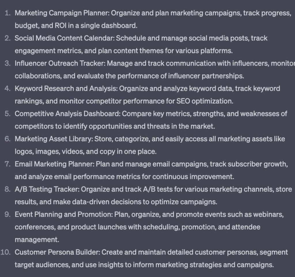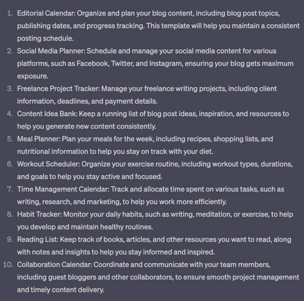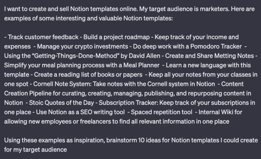 Prompt: I want to create and sell Notion templates online. My target audience is [TARGET AUDIENCE]. Here are examples of some interesting and valuable Notion templates:-Track customer feedback - Build a project roadmap - Keep track of your income and expenses - Manage your crypto investments - Do deep work with a Pomodoro Tracker - Using the “Getting-Things-Done-Method” by David Allen - Create and Share Metting Notes - Simplify your meal planning process with a Meal Planner - Learn a new language with this template - Create a reading list of books or papers - Keep all your notes from your classes in one spot - Cornell Note System: Take notes with the Cornell system in Notion - Content Creation Pipeline for curating, creating, managing, publishing, and repurposing content in Notion - Stoic Quotes of the Day - Subscription Tracker: Keep track of your subscriptions in one place - Use Notion as a SEO writing tool - Spaced repetition tool - Internal Wiki for allowing new employees or freelancers to find all relevant information in one placeUsing these examples as inspiration, brainstorm 10 ideas for Notion templates I could create for my target audience.