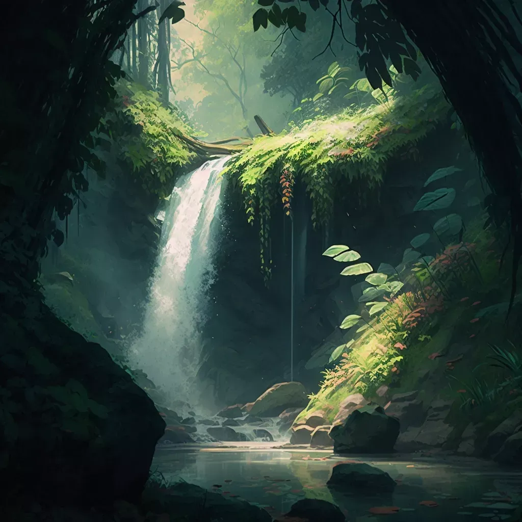- A serene waterfall in a lush tropical forest, with sunlight filtering through the canopy, painted in the style of Claude Monet. ::2 [Waterfall]::1 [Sunlight]::1 –ar 16:9(译文:郁郁葱葱的热带森林中的一个宁静的瀑布,阳光透过树冠,以克劳德-莫奈的风格绘制。 ::2 [Waterfall]::1 [Sunlight]::1 –ar 16:9)