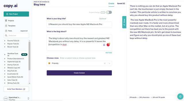 在我的具体案例中,我选择了博客,然后选择了写博客介绍。复制人工智能然后需要一些东西,包括博客的标题、目的和语气,并开始工作。正如大多数人工智能应用程序的惯例,它在短短30秒内就产生了输出。输出本身并不像ChatGPT或一些竞争者那样精巧,但也足够体面。默认情况下,Copy AI渲染了六个输出,你可以使用。注册该服务可以获得7天的试用期,但你可以以每月49美元的价格购买专业级的服务,以获得无限的词汇。看看吧。