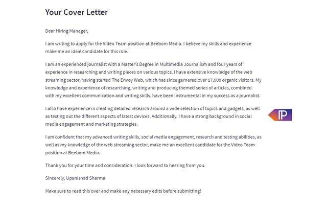 在考虑到所有这些因素后,人工智能搅动了一分钟,输出了一封求职信。值得称赞的是,除了一两个错误外,人工智能给我的求职信几乎一针见血。值得注意的是,准确性也取决于你的简历和JD,以及它们是否包含准确的信息,开始时。你可以随时重新运行Cover Letter AI,获得多封信件。Cover Letter AI目前是完全免费使用的,并没有锁定在任何信用额度后面。因此,请提前告诉我们它是否是你使用过的最好的AI写作应用程序之一。