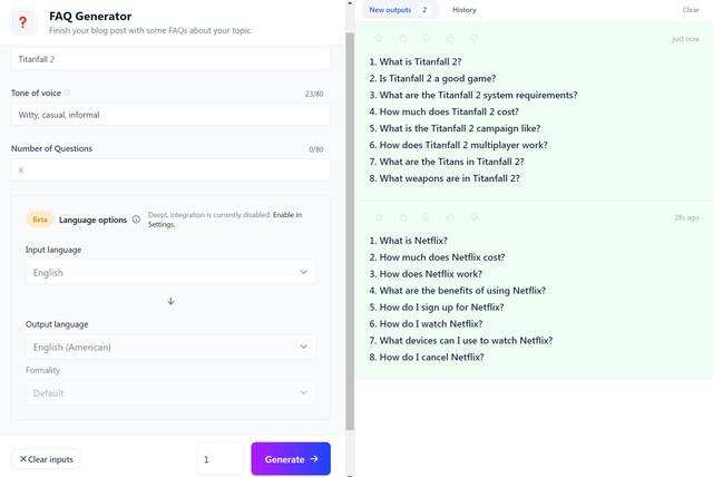 Jasper AI包含大量模板,涉及博客大纲、内容改进、FAQ生成器、清单、个性化的冷电子邮件,甚至还有Tweet生成器。虽然性质不同,但这些工具大多以相同的方式工作。Jasper需要一个提示,在上图中是常见问题生成器的一个主题。然后,该工具决定其他设置,并采取一些设置和渲染输出。从我测试的各种工具来看,一切都运行得相当好,包括FAQ生成器、博客文章写作、介绍创建者和文本编写者。