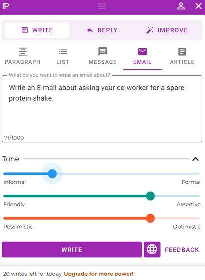 写作类别包括各种内容类型,如文章、列表、信息、电子邮件等等。只需点击其中任何一个,就可以为人工智能提供背景。你甚至可以选择性地调整语调,在正式/非正式、友好/自信、悲观和乐观之间进行选择。完成后,点击编写按钮并接收输出。然而,如果你想改进或解释文本,那么请选择这一点,Paragraph AI将为你做这件事。这款人工智能写作应用给你提供了25个免费的写作,他们每天都在充电。值得庆幸的是,如果你购买年度计划,每月12.5美元的升级费用是可以承受的。