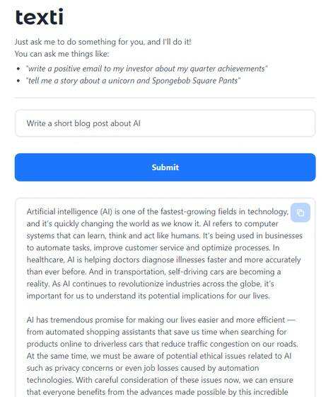 安装扩展后,你可以使用Texti人工智能向它提问,进行对话,或将它作为一个文案工具。Texti可以创建博客文章、文章、短篇故事、散文、广告副本等。尽管它是通过扩展程序工作的,但反应超级快,几秒钟内就能得到产出。还有一个方便的档案部分,你可以输出其他用户生成的提示。这对一般的研究或只是普通的乐趣很有帮助。