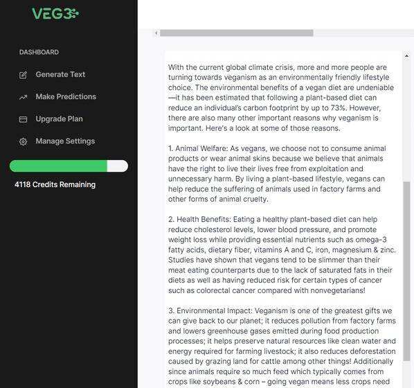 VEG3带有各种工具,有助于文本的生成,包括反素食评论回复器、食谱生成器、元广告标题、自由式生成器等等。虽然这项服务的基础是反肉类,但我发现它实际上对这个话题也很有效。除此之外,你还可以将VEG3用于其他各种事情,包括博客文章、散文和其他主题。