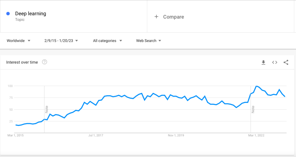 一个短语在搜索引擎上被搜索的次数是其受欢迎程度的代表。你可以看到下面 “deep learning” 在谷歌上被搜索的频率。