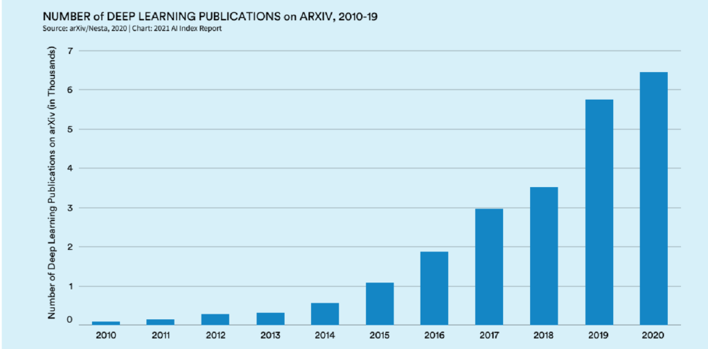 ArXiv上的深度学习出版物的数量在过去五年中增加了近6倍,根据AI Index,它为开发AI应用提供了全球来源的数据,ArXiv是一个物理学、数学、计算机科学等科学文章的开放获取平台。它包括同行评议的和非同行评议的文章。