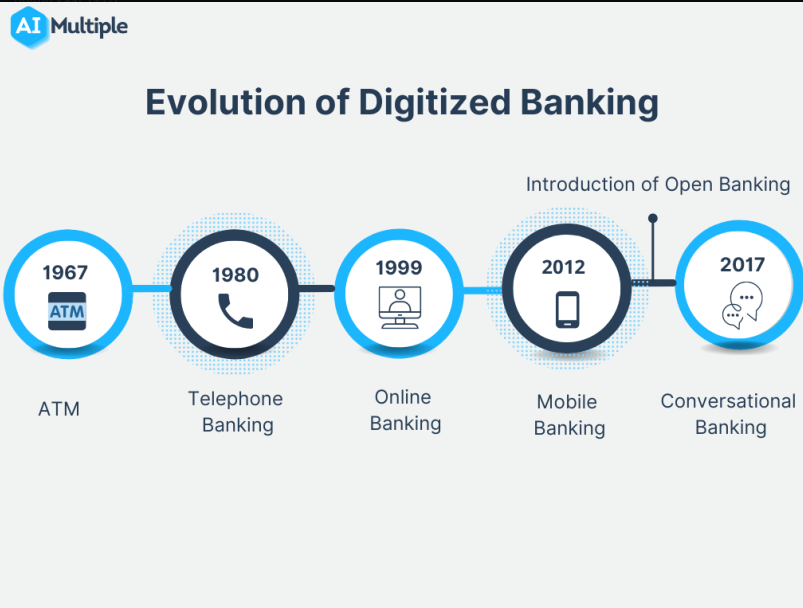 从历史的角度来看,银行的数字化始于ATM机,然后是电话银行。演变过程之后是网上银行和移动银行,现在我们正处于对话式商务的时代(见图1)。